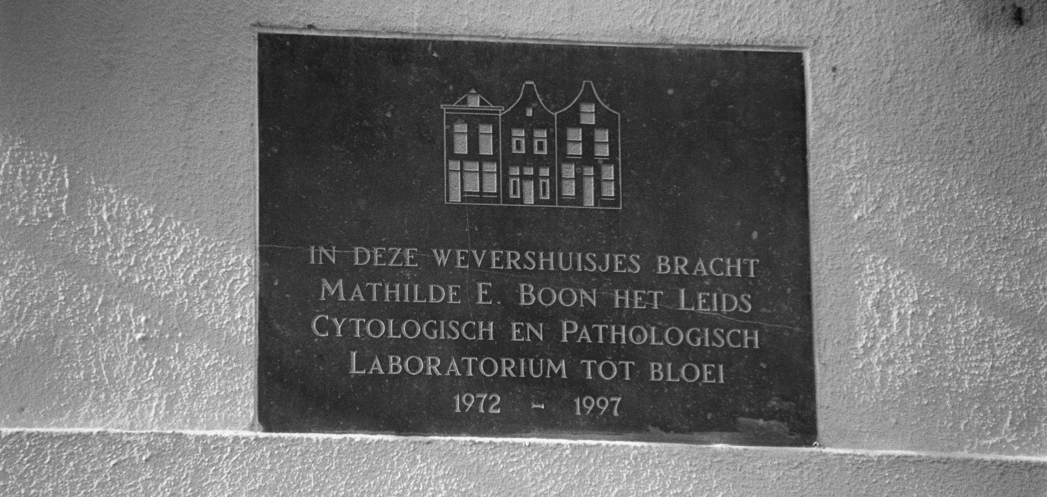 The plaque on number 63 Groenesteeg commemmorates the first 25 years of the Leiden Cytology and Pathology Laboratory. It was founded by Mathilde Elizabeth Boon, who developed a better method for detecting cervical cancer at an early stage.