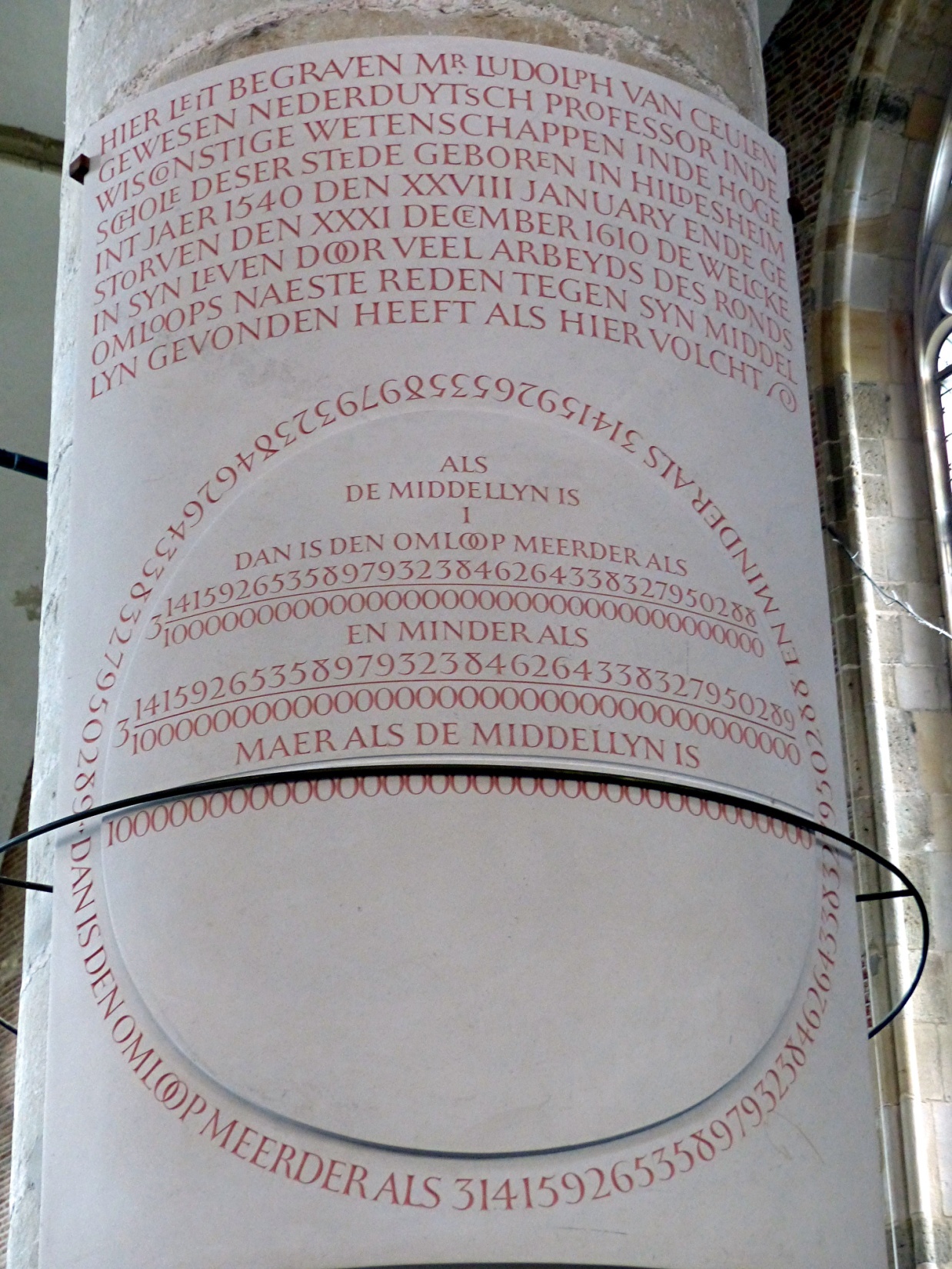 Inside the church is this memorial for Ludolph van Ceulen (1540-1610), mathematician and Leiden University professor. He was the first to calculate the first 35 decimals of Pi, using the same method Archimedes used about 2000 years earlier to calculate the first two decimals.